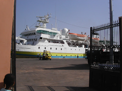 The couchettes were comfortable, as I'd booked with Gianni I was in the mens dorm but managed to persuade someone to change their couchette with me so that I could be between the wall and Gianni. The crew were extremely friendly, to the point that Gianni told one of them that we were married; unbeknown to me. I mistakenly managed to unfortunately dispell that rumour within minutes, as I didn't realise he'd said it!!! We got away from them all and went up on deck to attack the bottle of Fanta mixed with some of the gin whilst deliberating whether we had time & money to get as far as Liberia; somewhere I'd love to see and Gianni needed an English speaker to go there ... we were keen but it never came off!