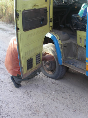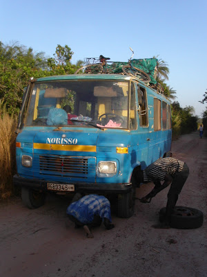 We spent 4hrs in the sun from 11am waiting for the minibus to fill up, eventually we set off on tarred road; which lasted about 3km and then it was a fairly rough track. Our Portuguese was non-existant but we met a Gambian on the bus who spoke some English so had a chat with him in between being thrown around in the back. Two hours into the journey the front tyre blew ... Gianni went to investigate and help out; the rest of us waited about 40mins on the side of the road we wondered whether they'd be room at Chez Helene and what kind of place it might be ...